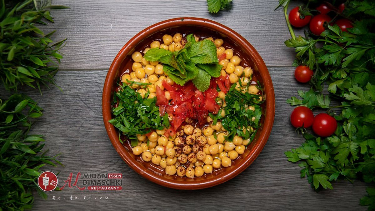 5 Stück mit frittierten, pürierten Kichererbsen, Blattsalat und Tomaten