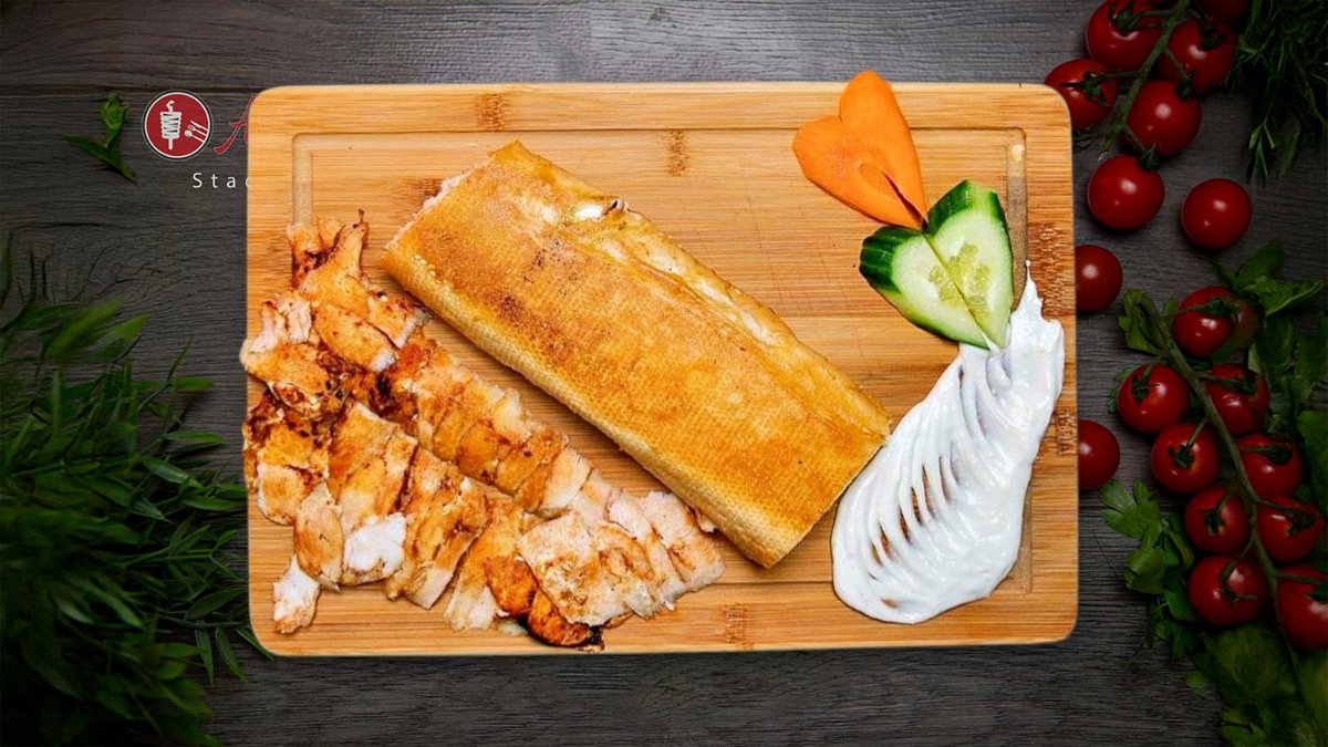 mit Knoblauchsoße, Gewürzgurken und arabischem Brot