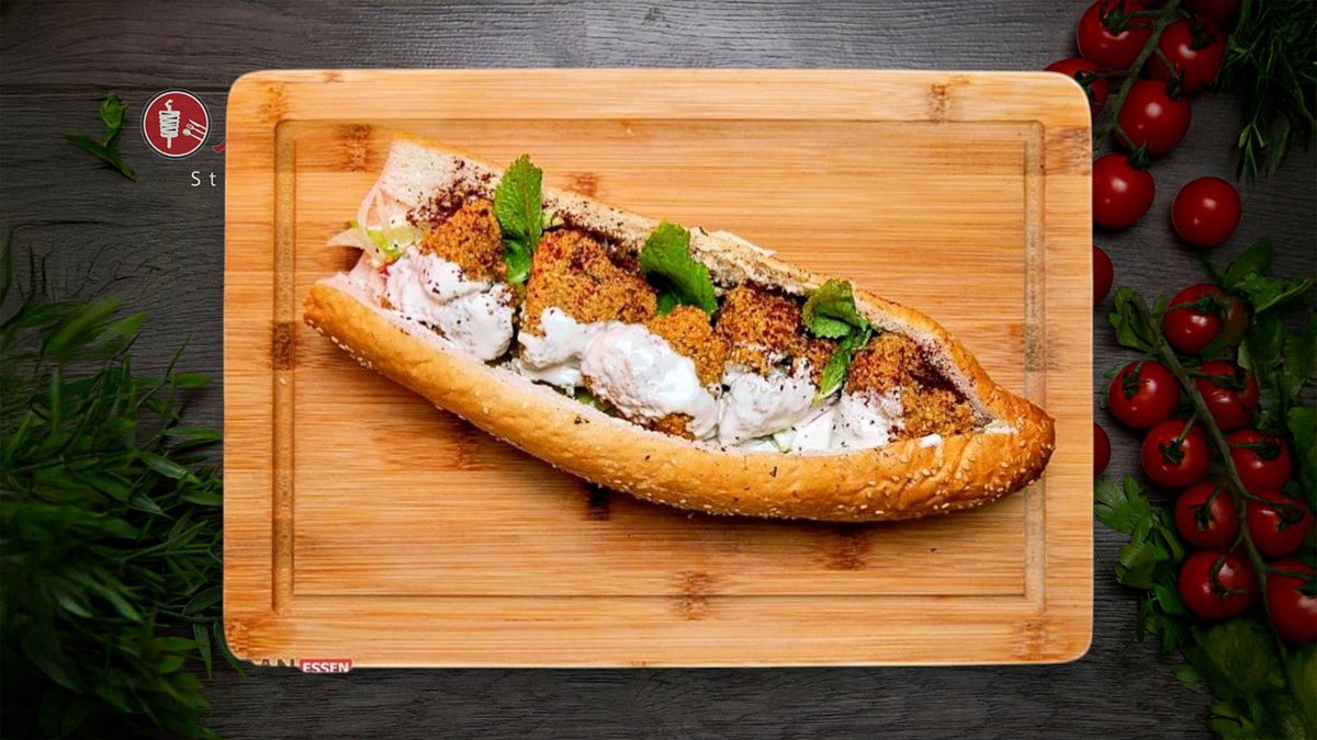 mit Falafel Sandwich, Tomaten, Joghurt und frittierten, pürierten Kichererbsen