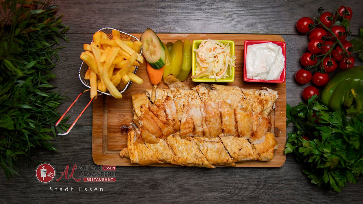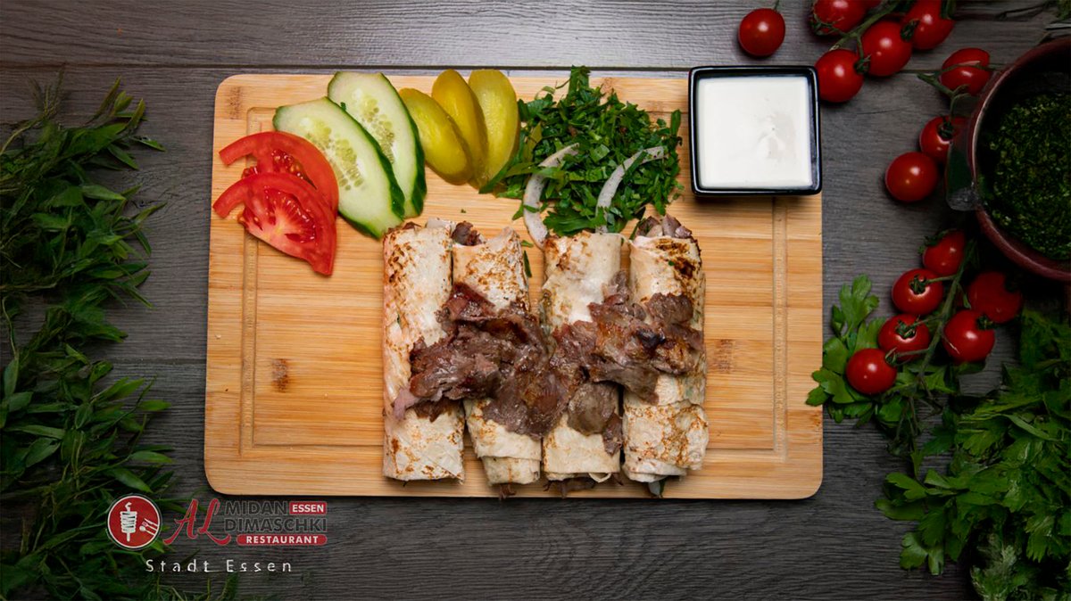 mit kleinen Schawarma-Rollen, Soße, Pommes frites, Salat und Gewürzgurken