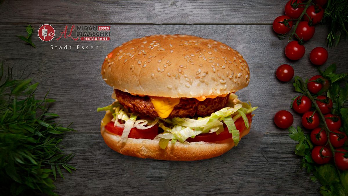 Hackfleisch mit Tomaten, eisbergsalat, Gewürzgurken, Cheddar-Käse, Cocktailsoße. Das Menü enthält: Pommes frites, Knoblauch-Dip, Gemüse Sauer Eingelegt, und Krautsalat