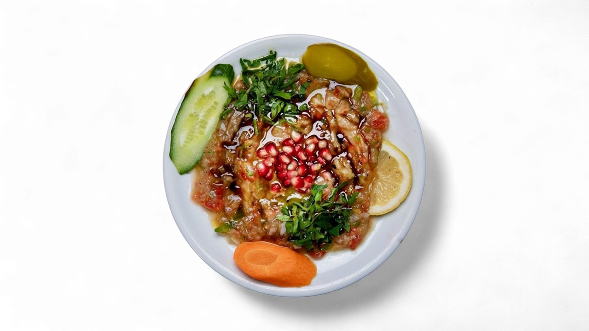 with grilled eggplants, tomatoes, green bell peppers, parsley, onions, pomegranate and olive oil