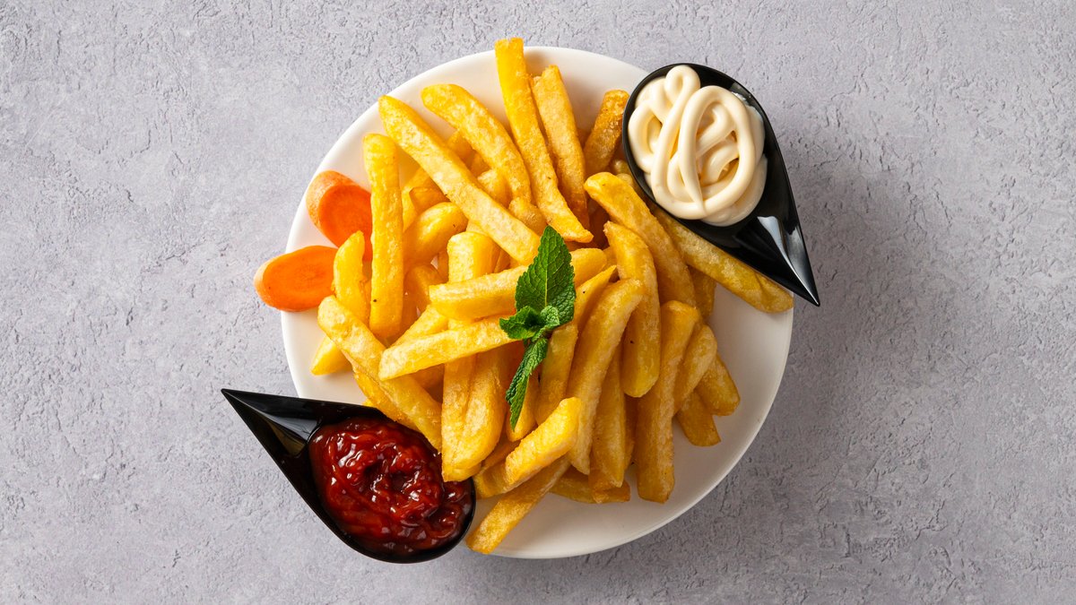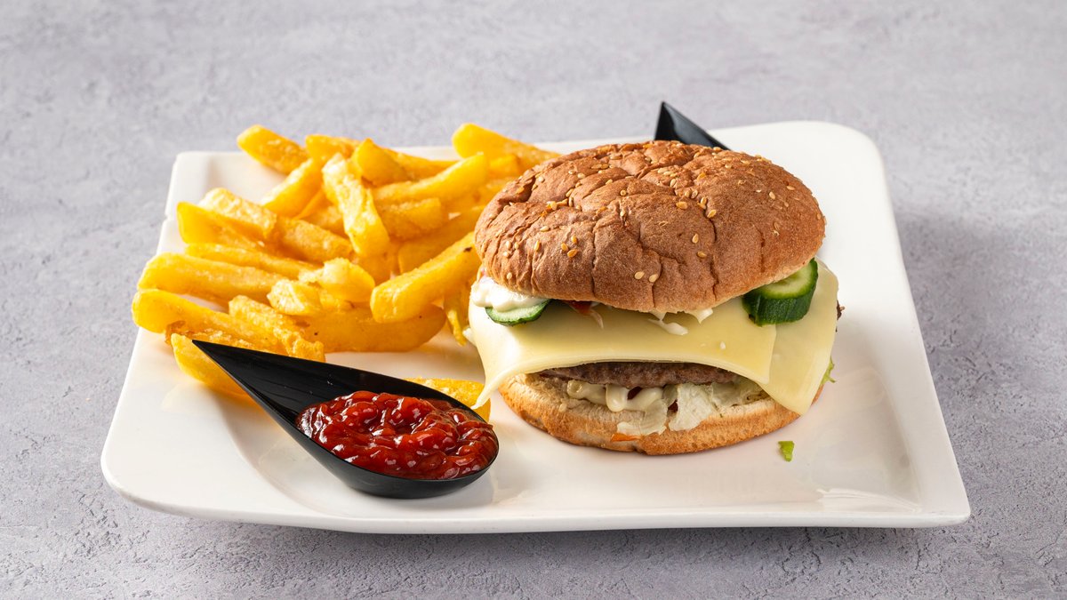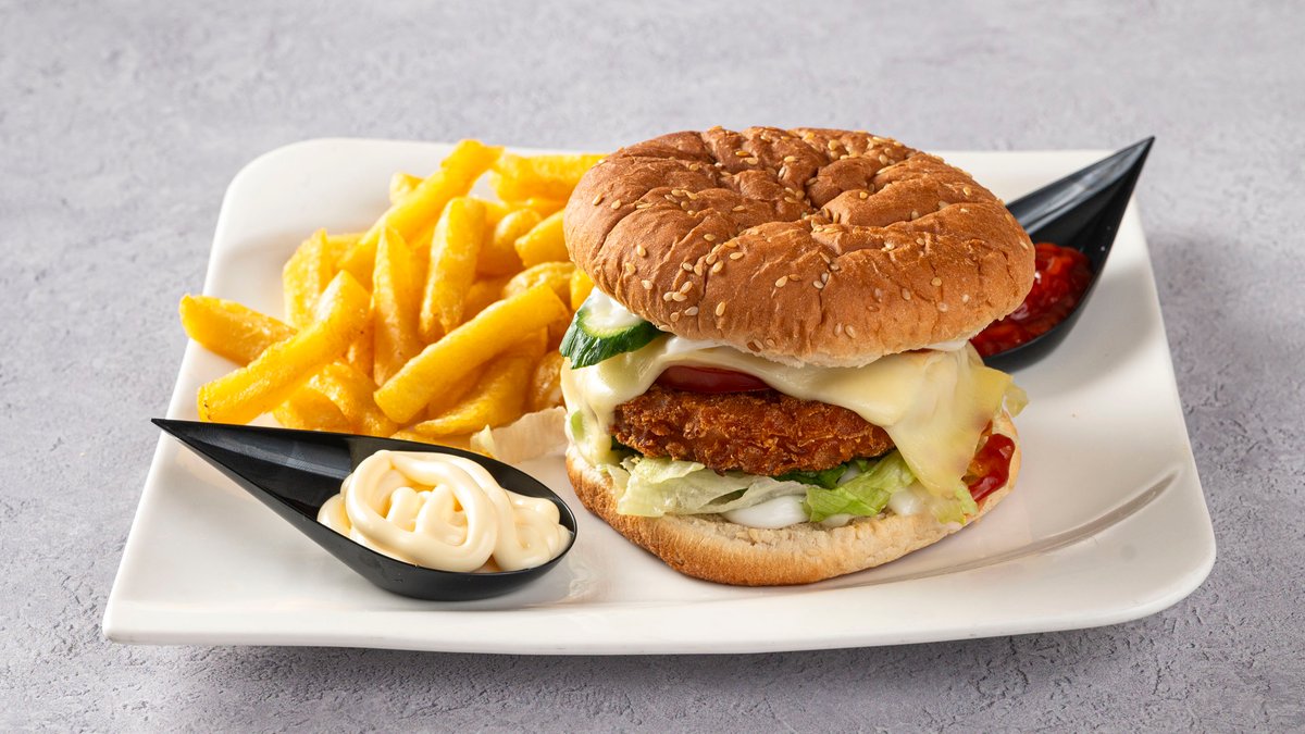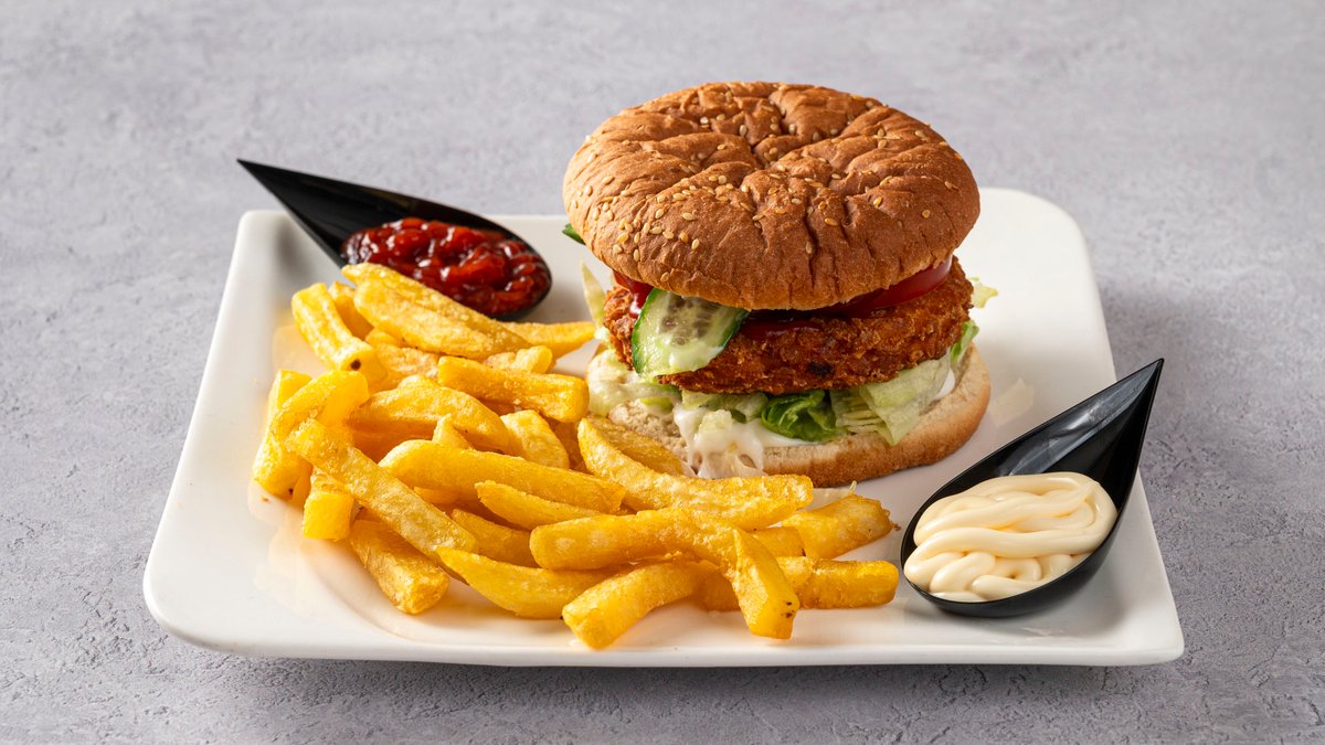 with minced chicken skewer, French fries, onions, tomatoes and iceberg lettuce
