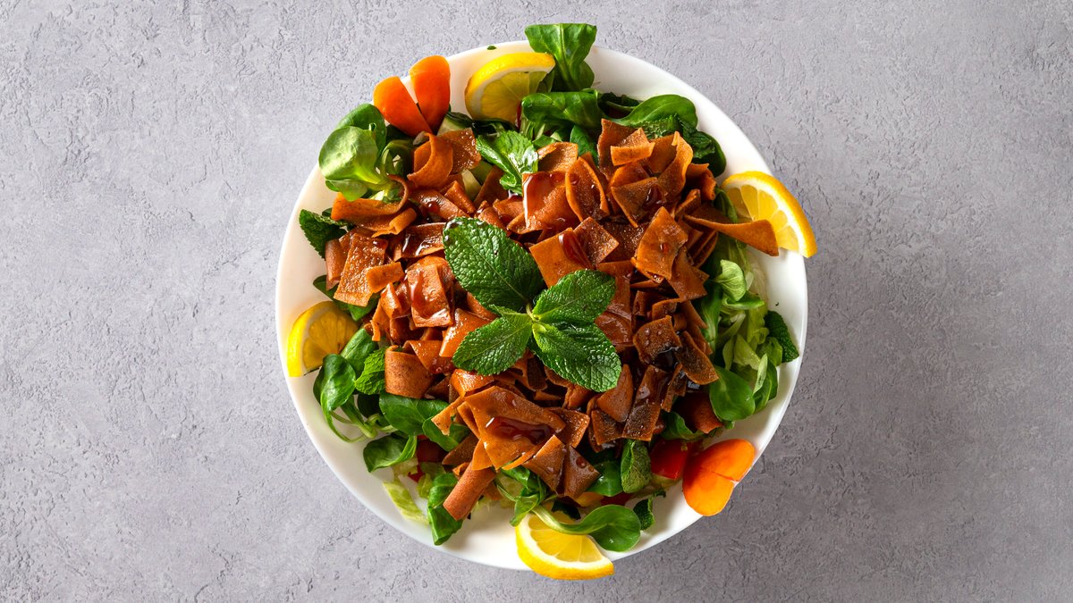 with cucumbers, tomatoes, parsley, fried Arabic bread, vegetables, vinegar and olive oil