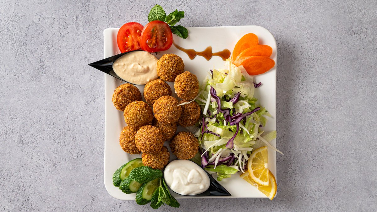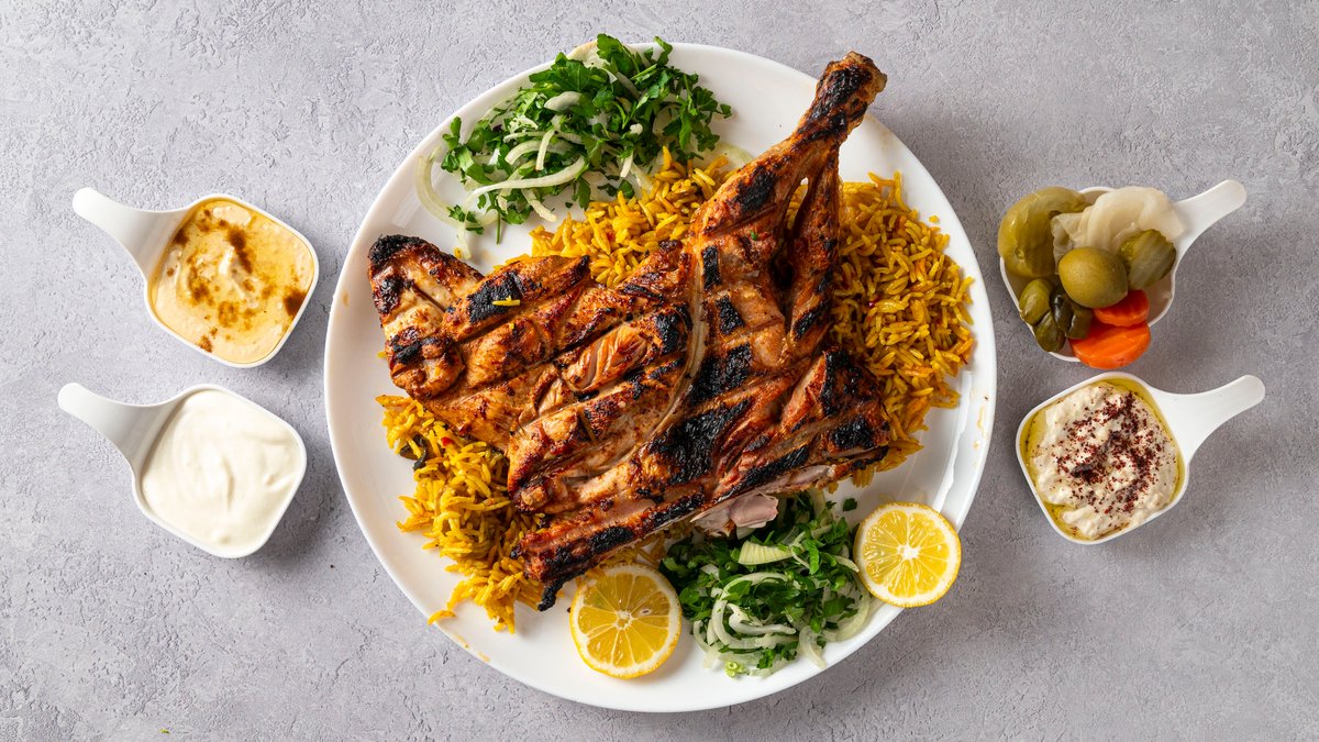 all platters are served with salad, hummus, mutabal, Arabic flatbread, muhammara, tomatoes, onions and bell peppers