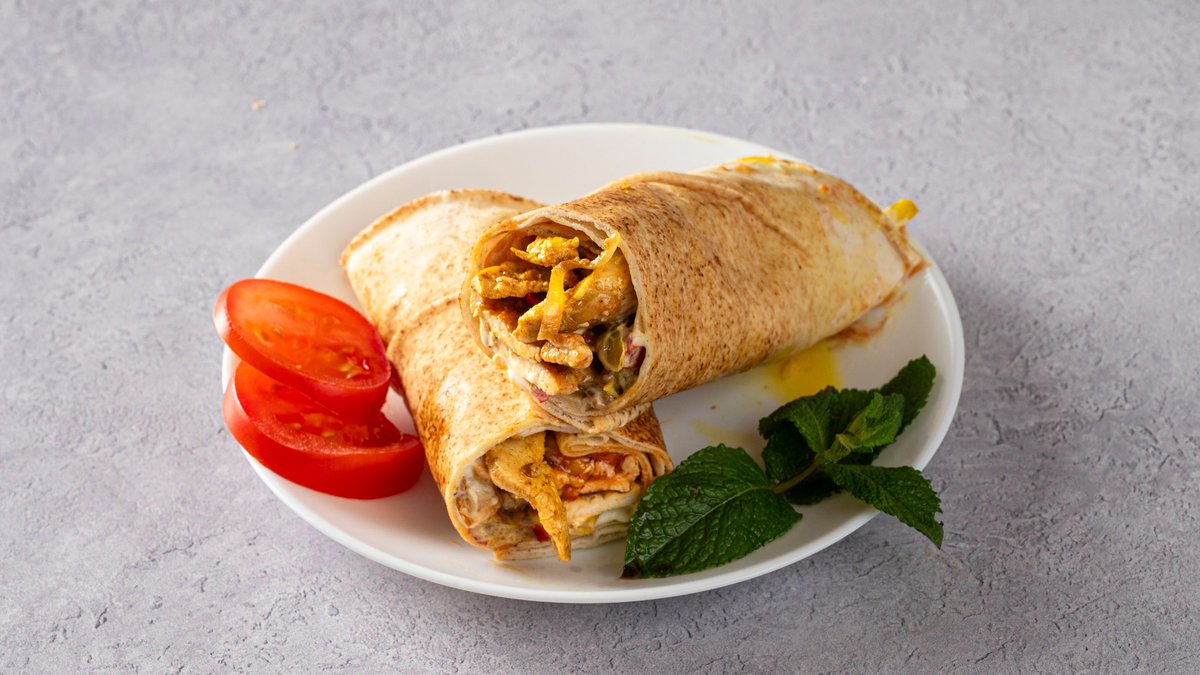 with chicken shawarma, pickled cucumbers, garlic cream and a side dish of your choice