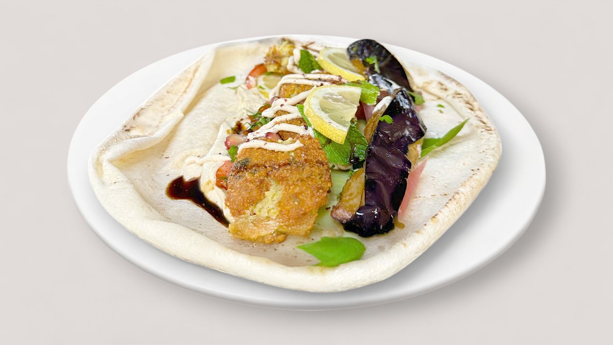 Knusprig frittierte Falafel-Bällchen kombiniert mit goldbraun frittierter Aubergine, eingerollt in arabischem Fladenbrot und verfeinert mit Hummus, Sesam Dip, Granatapfelsirup, Mukhalal – eingelegten Rüben -, und gemischtem Salat