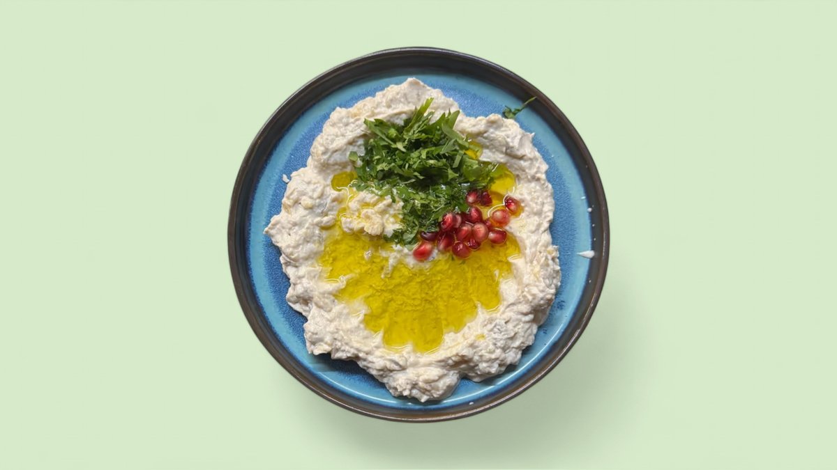 Cremige Paste aus gegrillter Aubergine, verfeinert mit Sesampaste und Olivenöl, serviert mit arabischem Fladenbrot (1 Portion Brot inklusive)