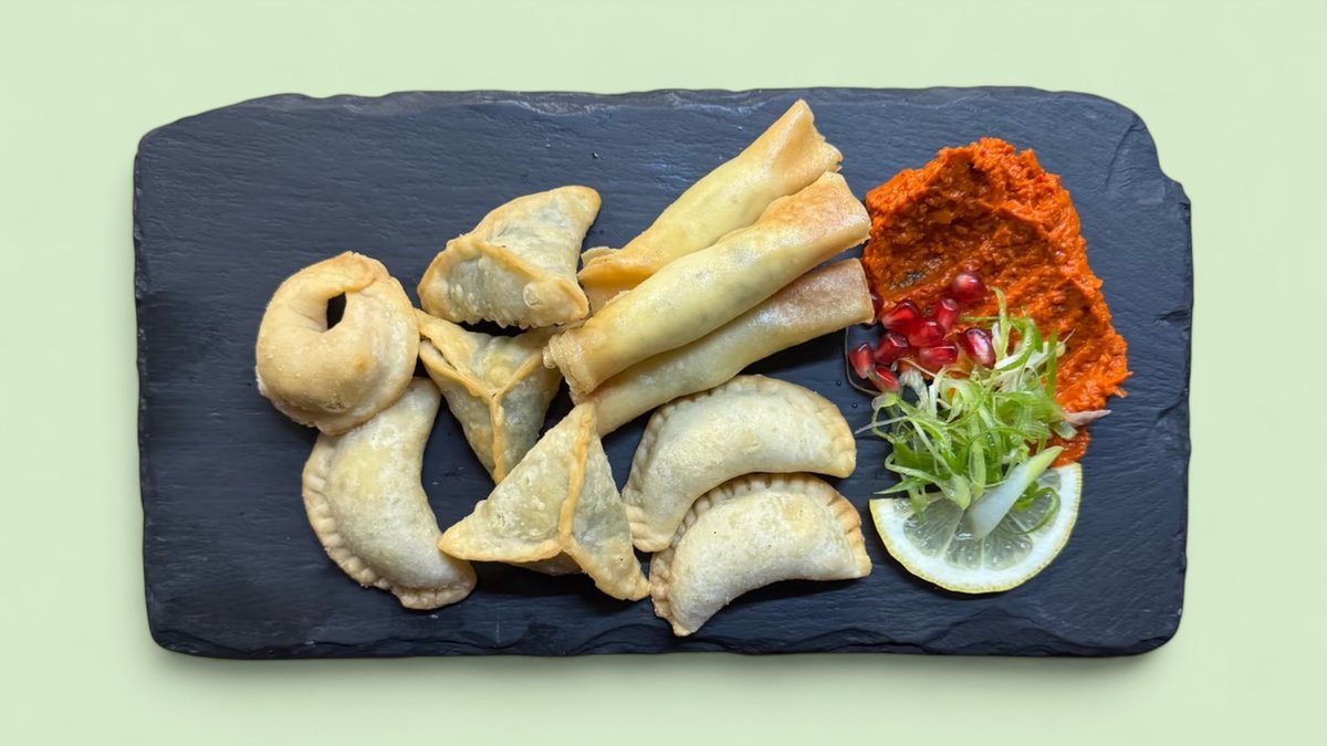 Warme Teigtaschen mit verschiedenen Füllungen, dazu scharfer Dip Nach Wahl: Gemischt (Hähnchen, Hackfleisch, Vegetarisch) (Standardoption) oder Vegetarisch (Käse, Spinat, Gemüse)