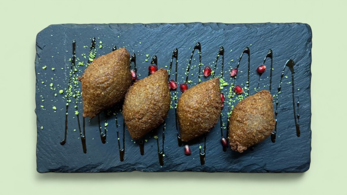 Runde frittierte Bällchen aus Bulgurteig, gefüllt mit Hackfleisch und Zwiebeln, garniert mit Granatapfelsirup