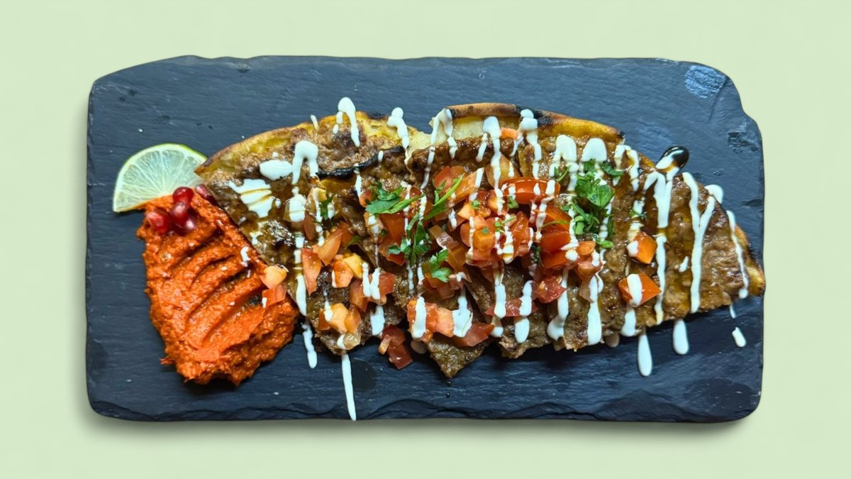 Gegrilltes arabisches Fladenbrot, gefüllt mit Hackfleisch aus Lamm und Rind, dazu scharfer Dip