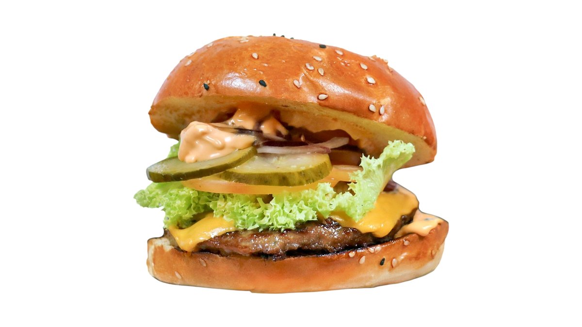 Saftiges Rindfleisch-Patty mit frischem Kopfsalat, Tomaten, Gewürzgurken, Zwiebeln und unserer hausgemachten Burgersoße – ein echter Klassiker.