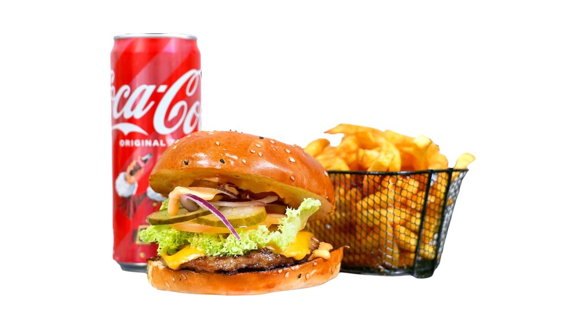 Zartes Rindfleisch-Patty mit geschmolzenem Cheddar-Käse, frischem Kopfsalat, Zwiebeln, Gewürzgurken und unserer cremigen Burgersoße. Serviert mit Medium Pommes, einer Sauce nach Wahl und einem Getränk nach Wahl.