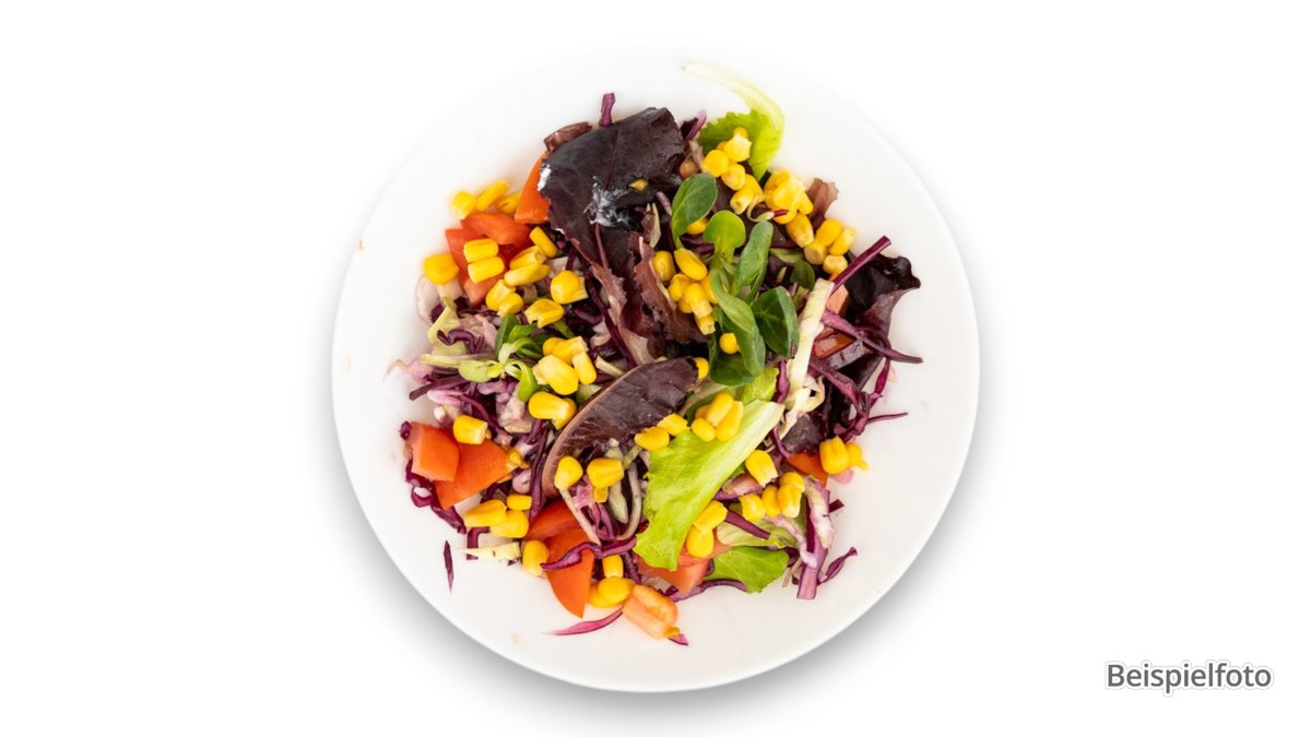 mit Eisbergsalat, Gurken, Tomaten, Mais, Möhren und roten Zwiebeln