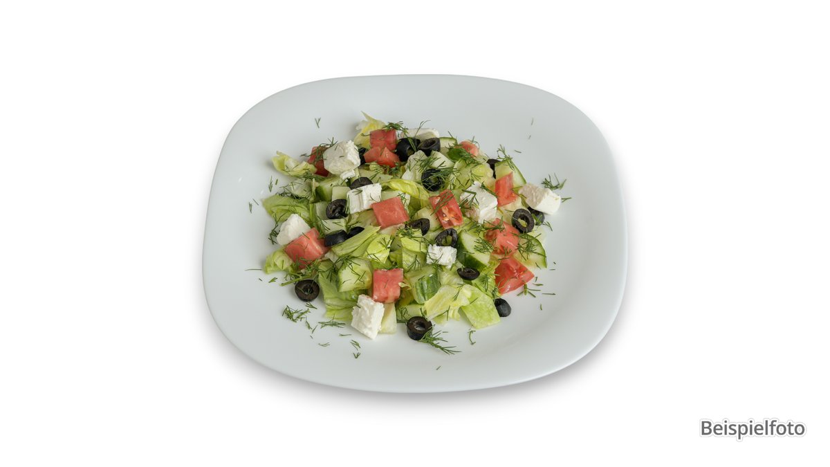 gemischter Salat mit geschwärzten Oliven und Hirtenkäse aus Kuhmilch