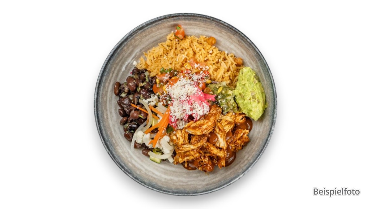 alle Gerichte werden mit Reis, Tomaten, Gurken, Zwiebeln, Mais und Eisbergsalat zubereitet