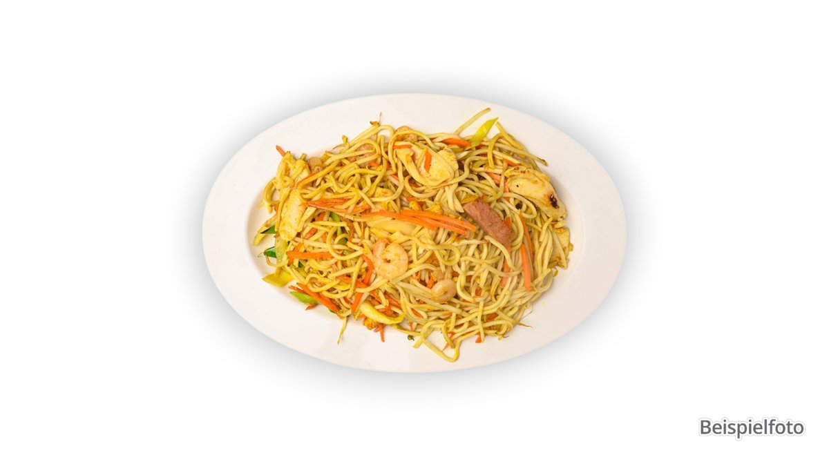 slightly spicy with prawns, chicken, eggs, roasted pork and curry