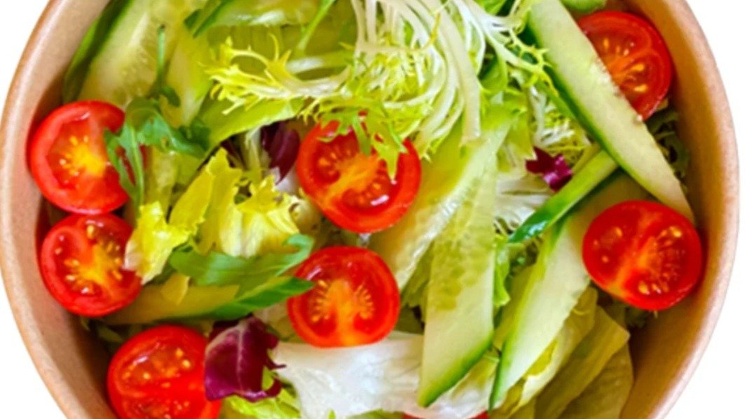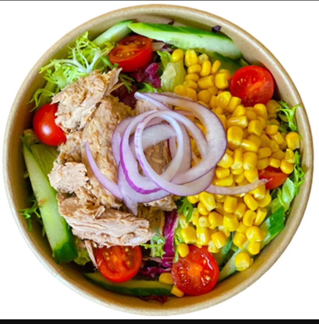 mit Thunfisch, Gurken, Tomaten, Weißkohl, Mais, Zwiebeln und Peperoni