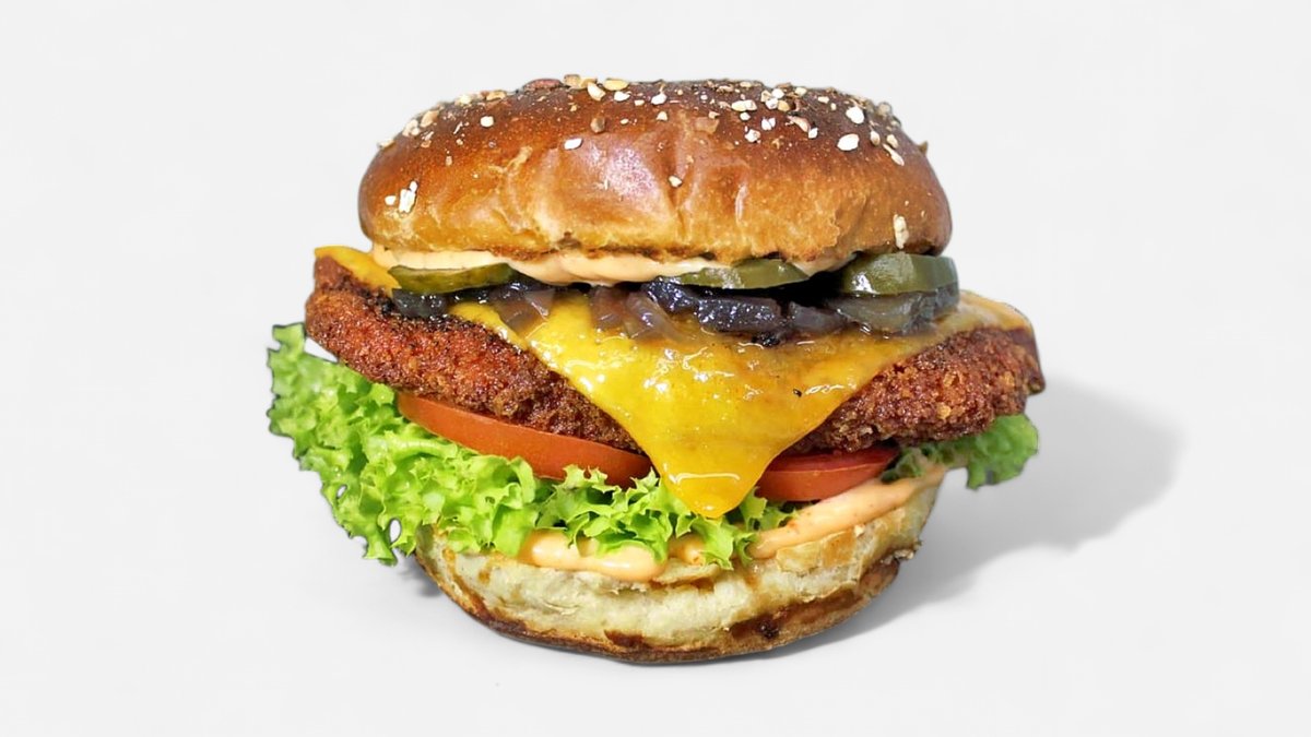mit veganem Patty, Cheddar, roten Zwiebeln, Salat, Tomaten, Gewürzgurken, veganer Mayonnaise und Ketchup
