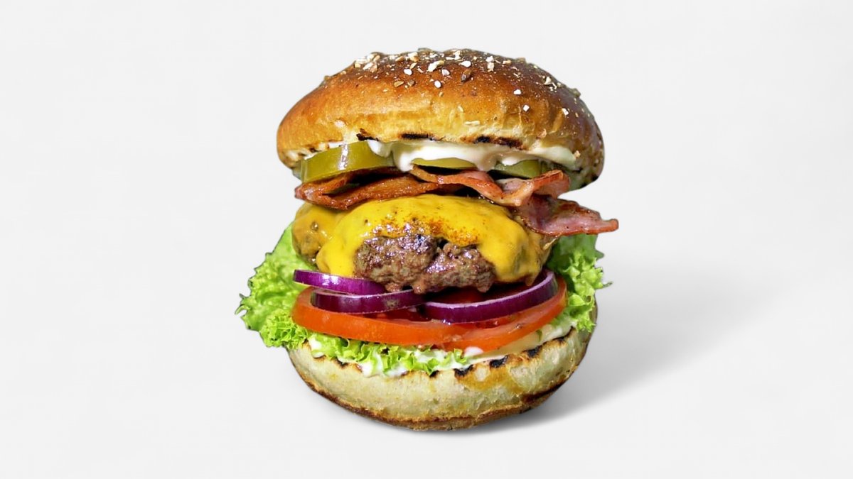 mit Rindfleisch-Patty, Speck, Cheddar, Salat, Tomaten, rote Zwiebeln, Gewürzgurken ,Jalapeno Mayonnaise
