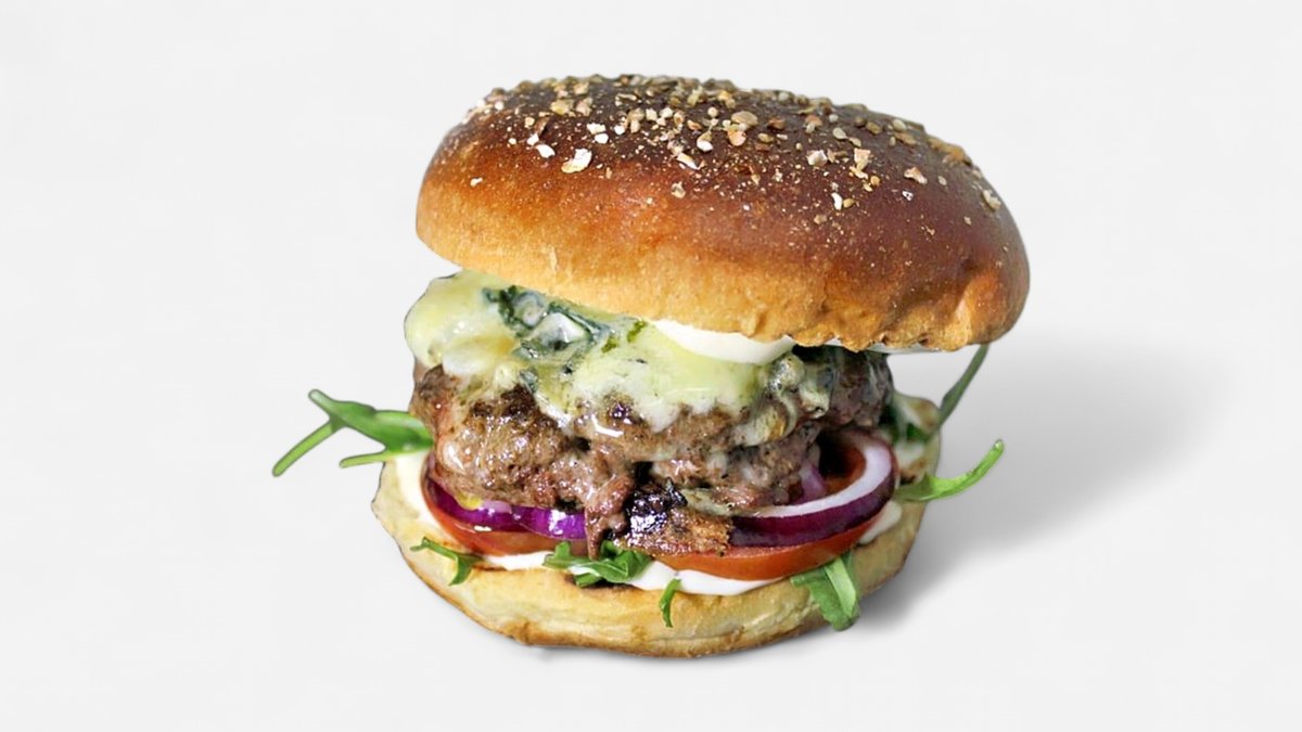 mit Rindfleisch-Patty, Blauschimmelkäse, Rucola, Tomaten, rote Zwiebel und Trüffel-Mayonnaise
