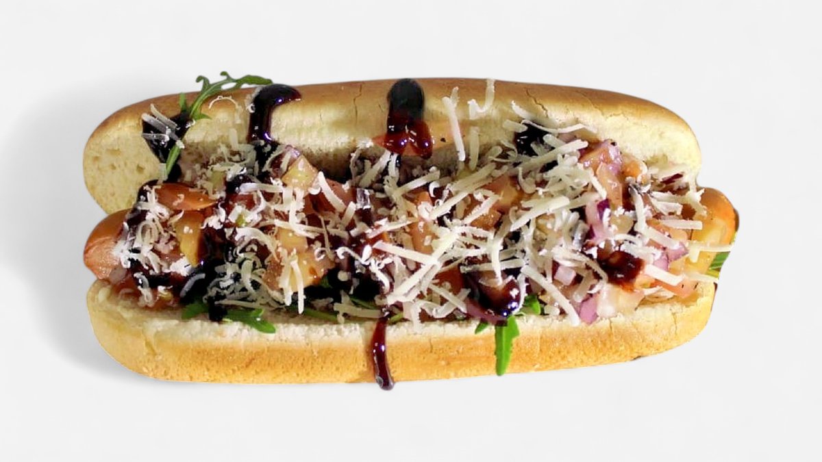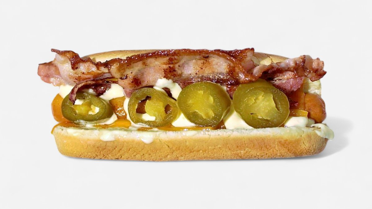 mit Bockwurst,Speck ,Cheedar Käse,Jalapenos,Käse Chilli Sauce