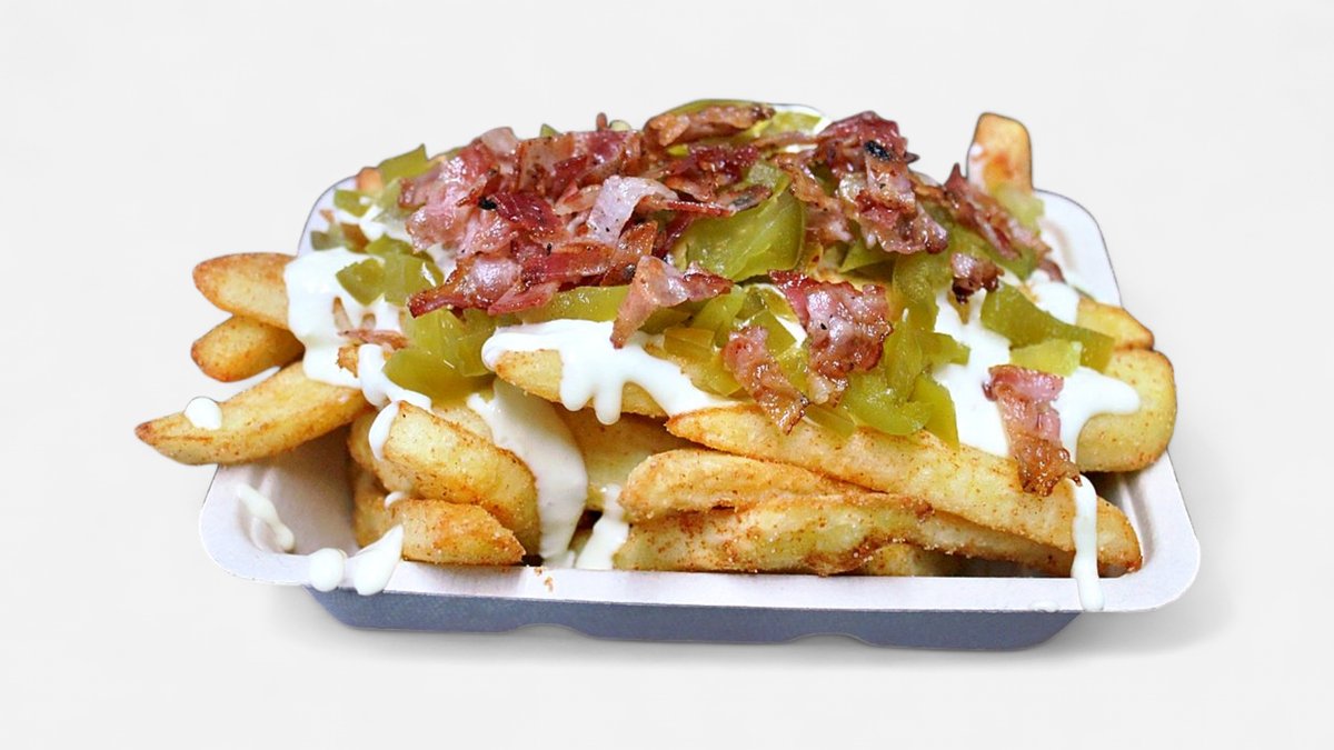 Pommesportoon mit Speck(Bacon),Jalapeno Mayonnaise,Jalapenos