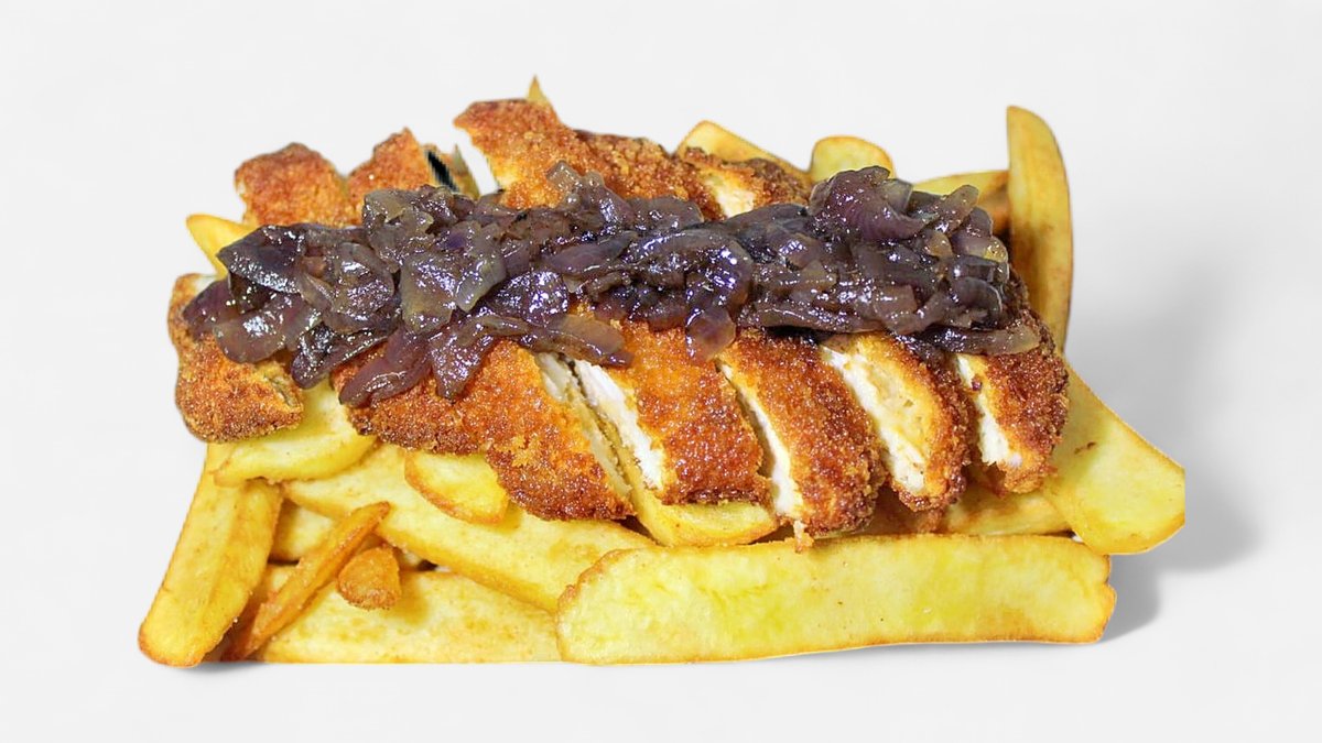 Pommes mit panierten in Panko Hähnchenbrustfilet und karamellisierten Zwiebeln