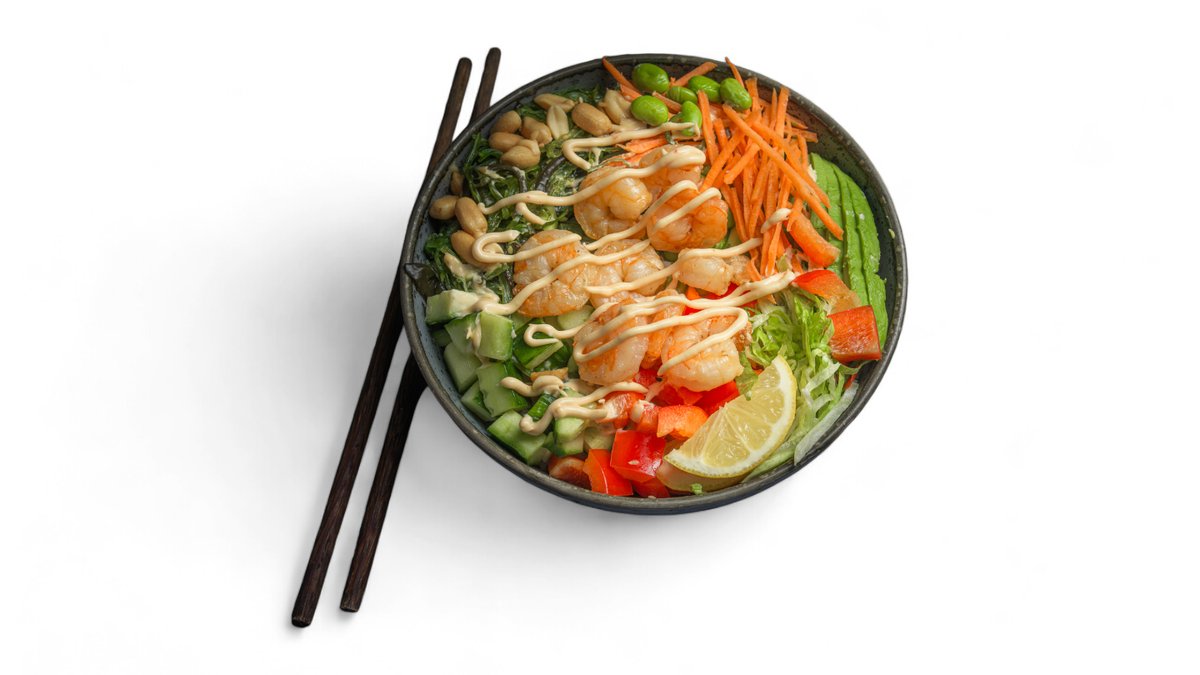 with mango, cucumber, rocket, peppers, bean sprouts, peanuts, coriander and sesame seeds