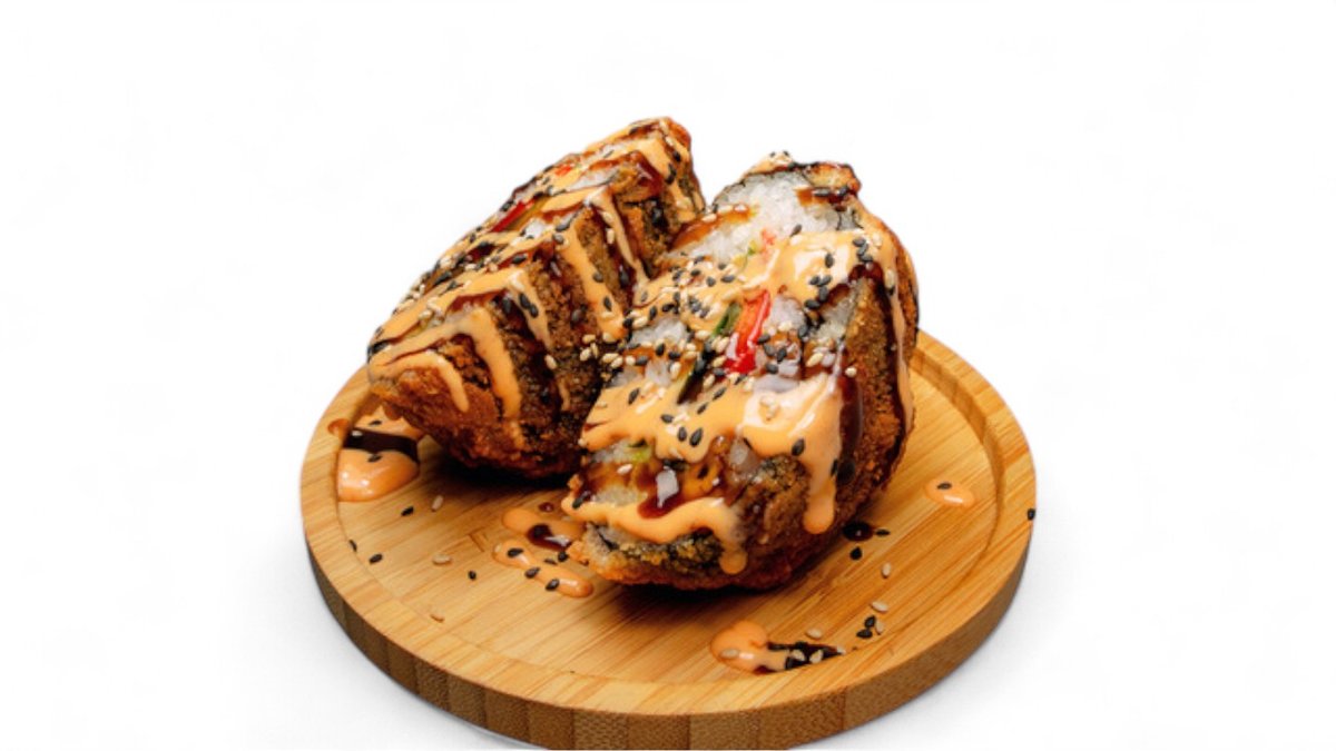 8 pieces Fried salmon in tempura batter with cream cheese, fresh rocket, fried onion coating and teriyaki sauce on top