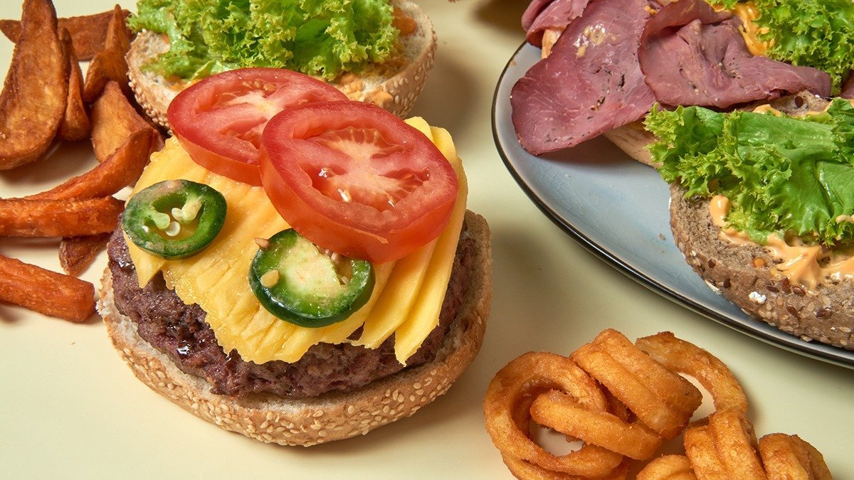 all burgers are served with 180g meat, lettuce, pickles, tomatoes, onions and French fries