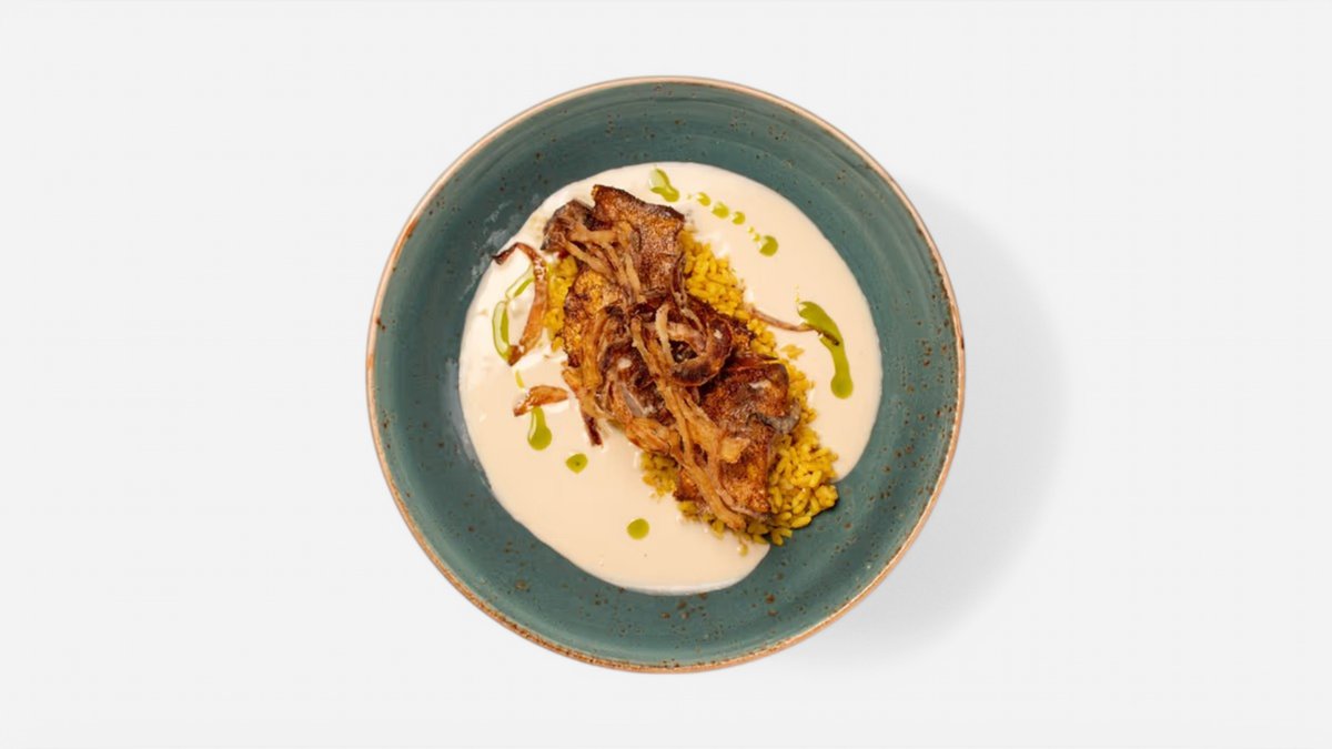 mit Safranreis, Fisch, knusprigen Zwiebeln und Zitronenvelouté