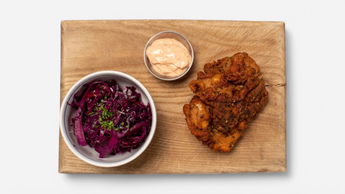 mit knusprigen Hähnchenkeulen, Rotkohl-Coleslaw und Chipotle-Aioli