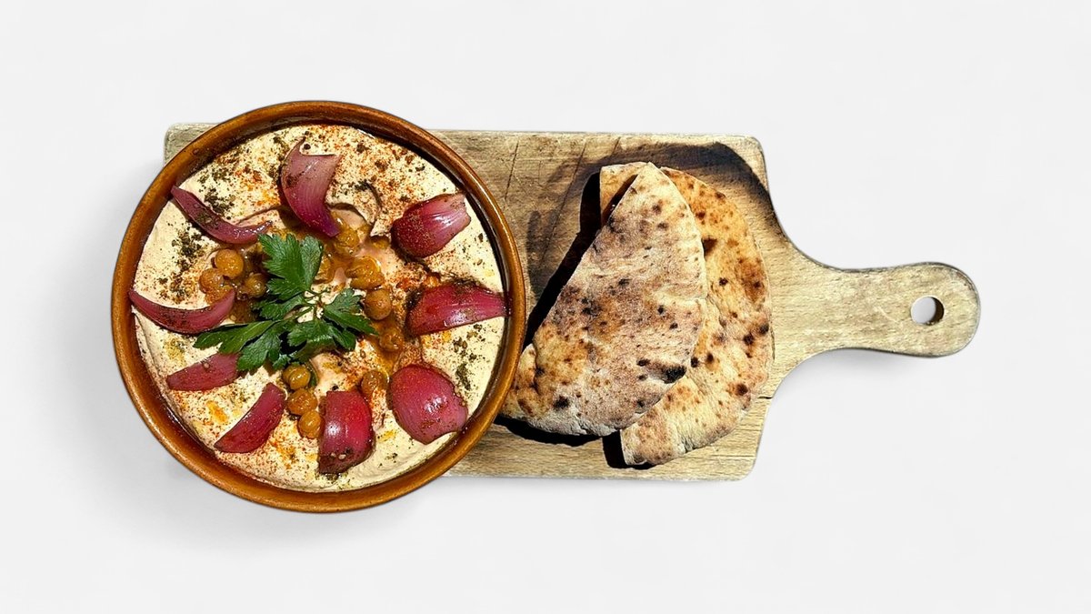 mit Hummus, gerösteten Kichererbsen, Sumach-Zwiebelspalten und Pita