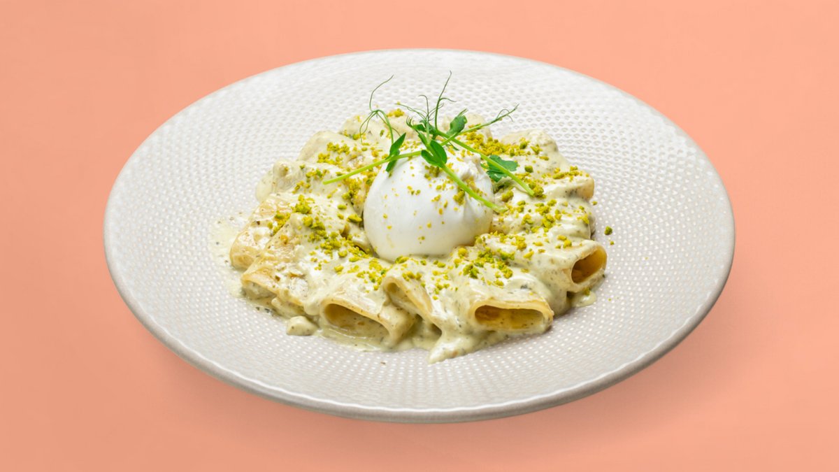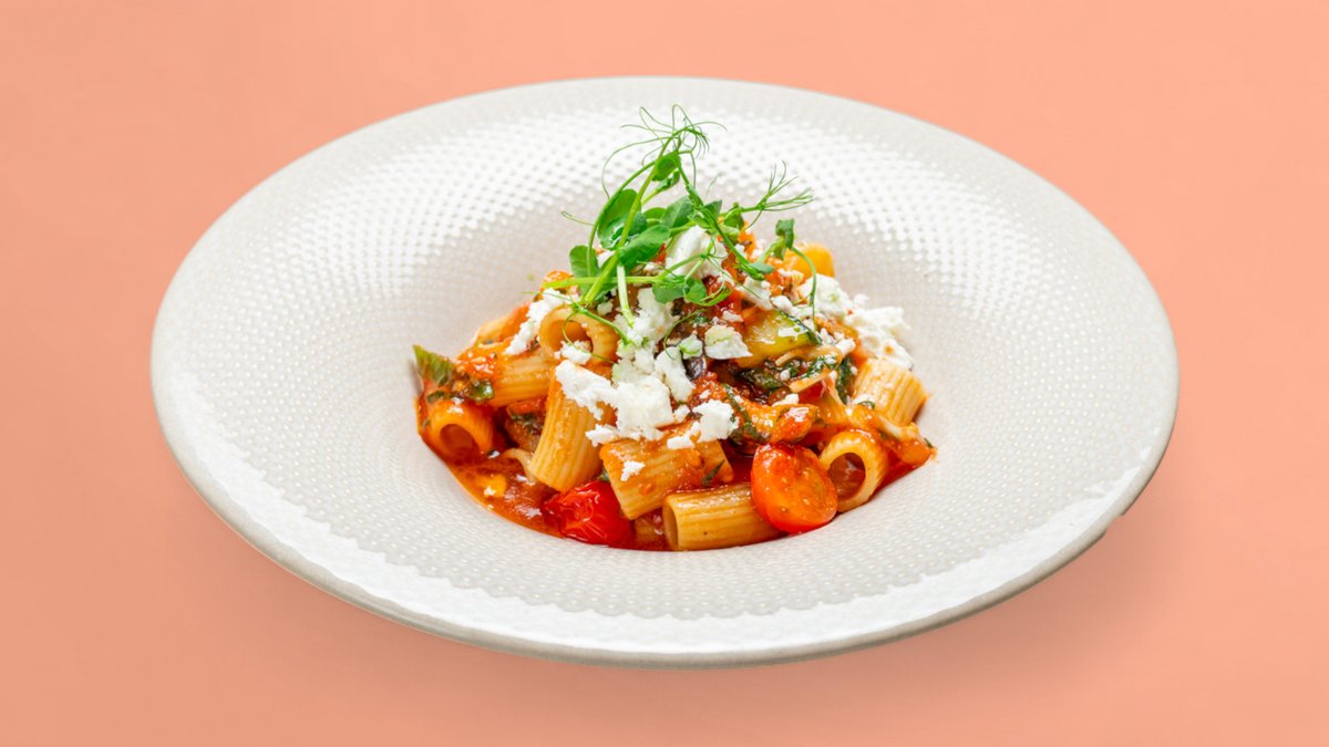 with zucchini, eggplants in tomato sauce, sheep cheese and basil