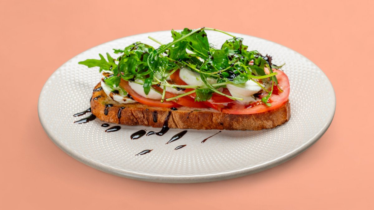 wheat sourdough bread with mozzarella, pesto, tomatoes, rocket and balsamic vinegar
