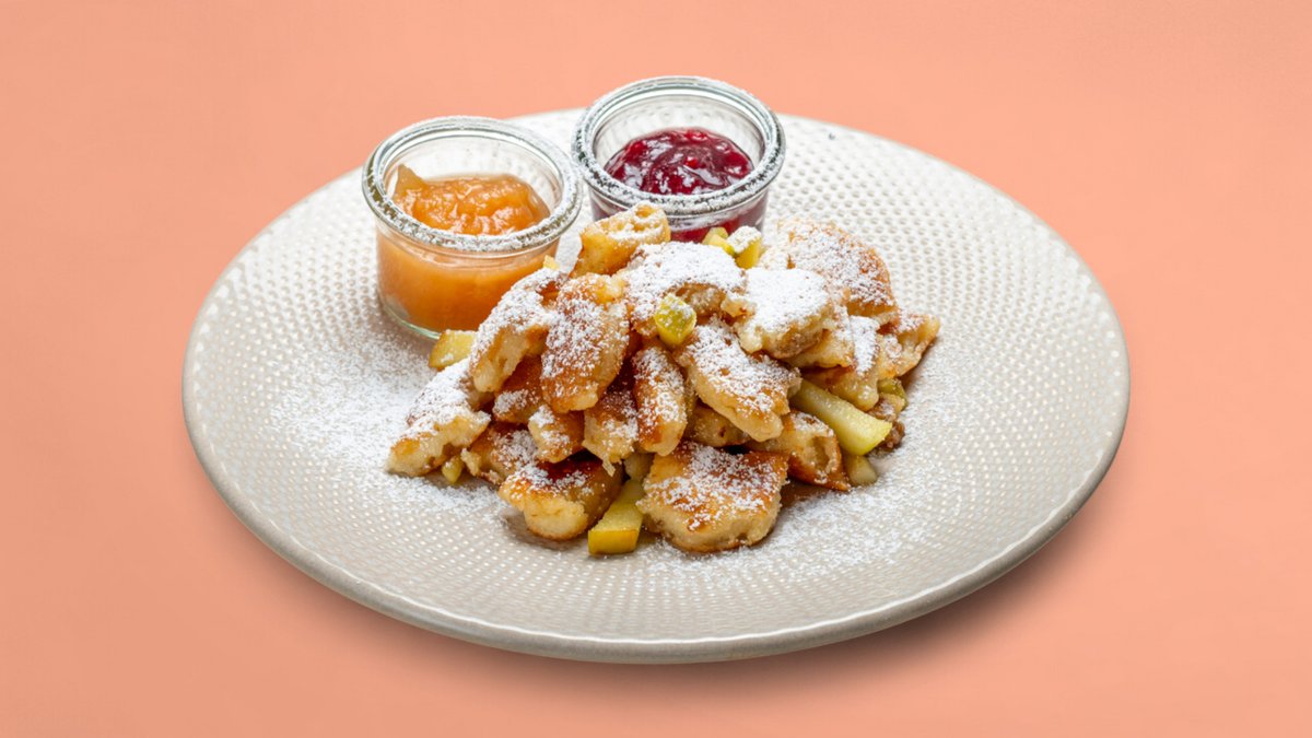 toast with ham from pork, Dijon mustard, crème fraîche, fried egg, topped with Gruyère and Emmental cheese and a small salad