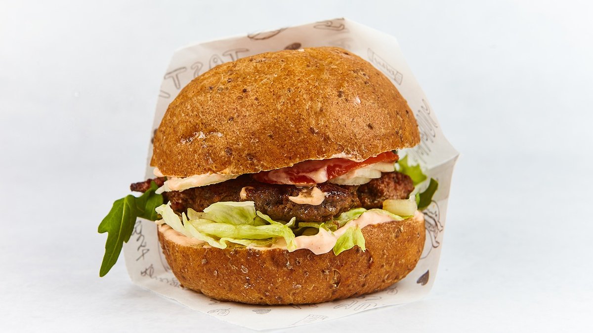 mit 100% magerem Rindfleisch, fettarmem Käse, Eisbergsalat, Tomaten, Zwiebeln, Gewürzgurken und kohlenhydratarmer, fettarmer Mangosoße