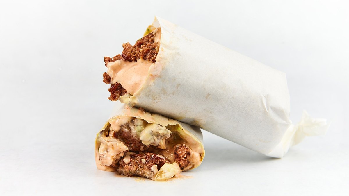 Wrap aus Chia- & Leinsamenteig mit gebratenem Hackfleisch (100 % mageres Rindfleisch), Eisbergsalat, Rucola, gebratenen Champignons, gebratenen Zwiebeln, dazu Joghurt-Kräutersoße