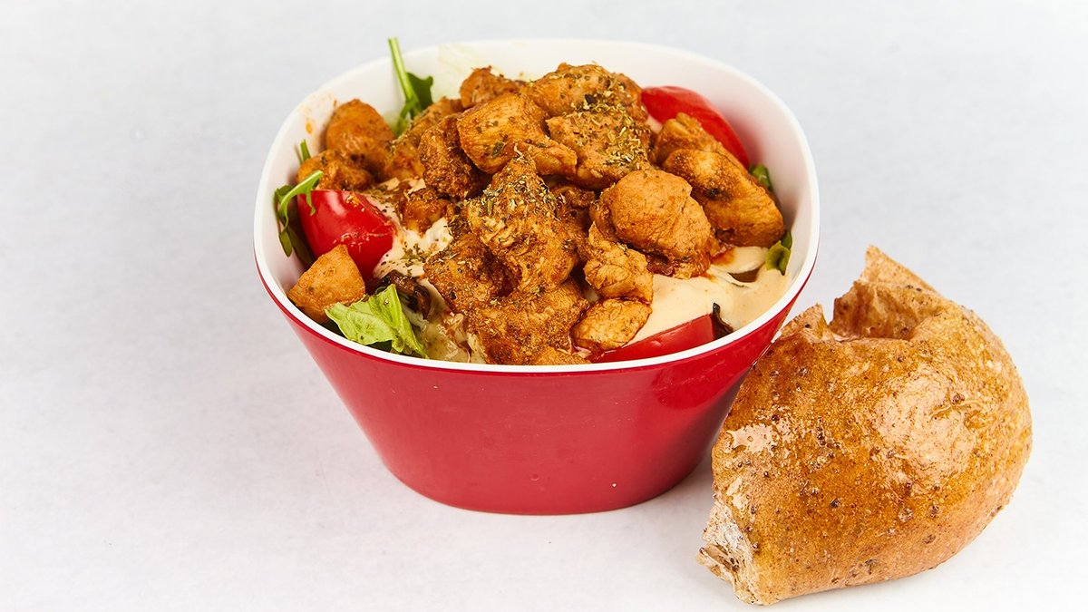 mit gebratenen Hähnchenbrust Filetstückchen, verschiedenen Salatblättern, Kraut, Tomaten, gebratenen Champignons und gebratenen Zwiebeln, dazu Joghurt-Kräutersoße