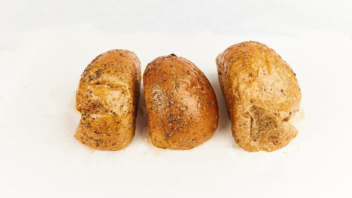 3 Stück hausgemachte, kleine kohlenhydratarme Brötchen aus Chia- & Leinsamenteig mit Kräuterbutter