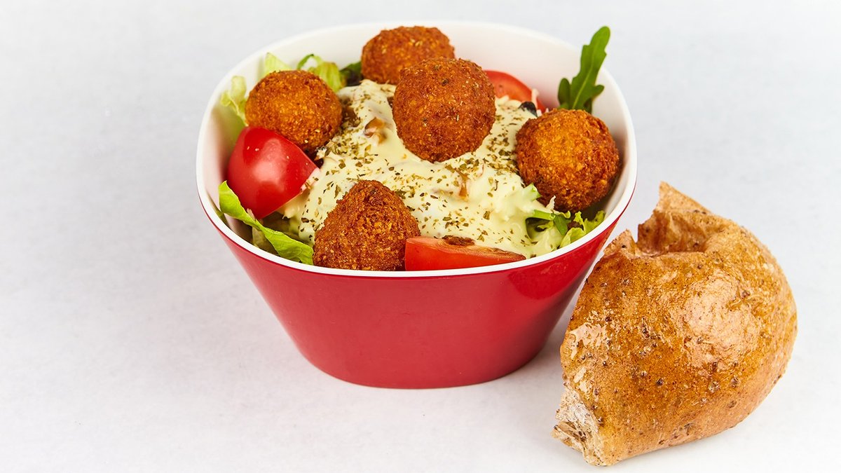 mit hausgemachten Falafelbällchen, verschiedenen Salatblättern, Kraut, Tomaten, gebratenen Champignons und gebratenen Zwiebeln, dazu Tahinesoße