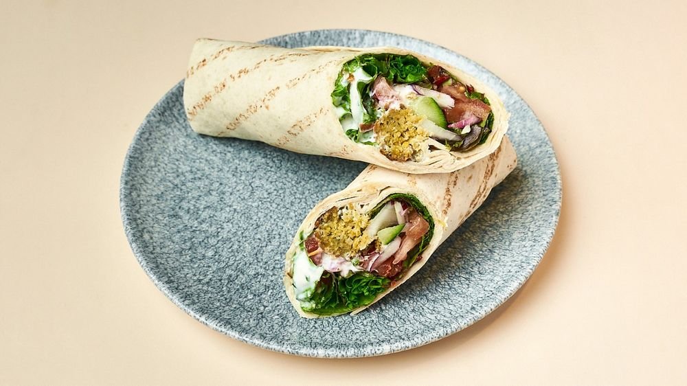 mit knackfrischem Salat, Gurken, roten Zwiebeln, Tomaten, Falafelbällchen und hausgemachten Kräuterquark