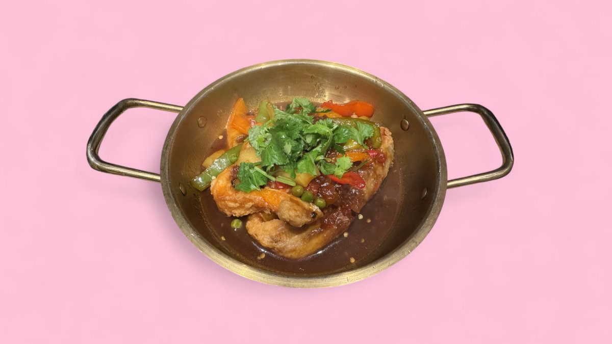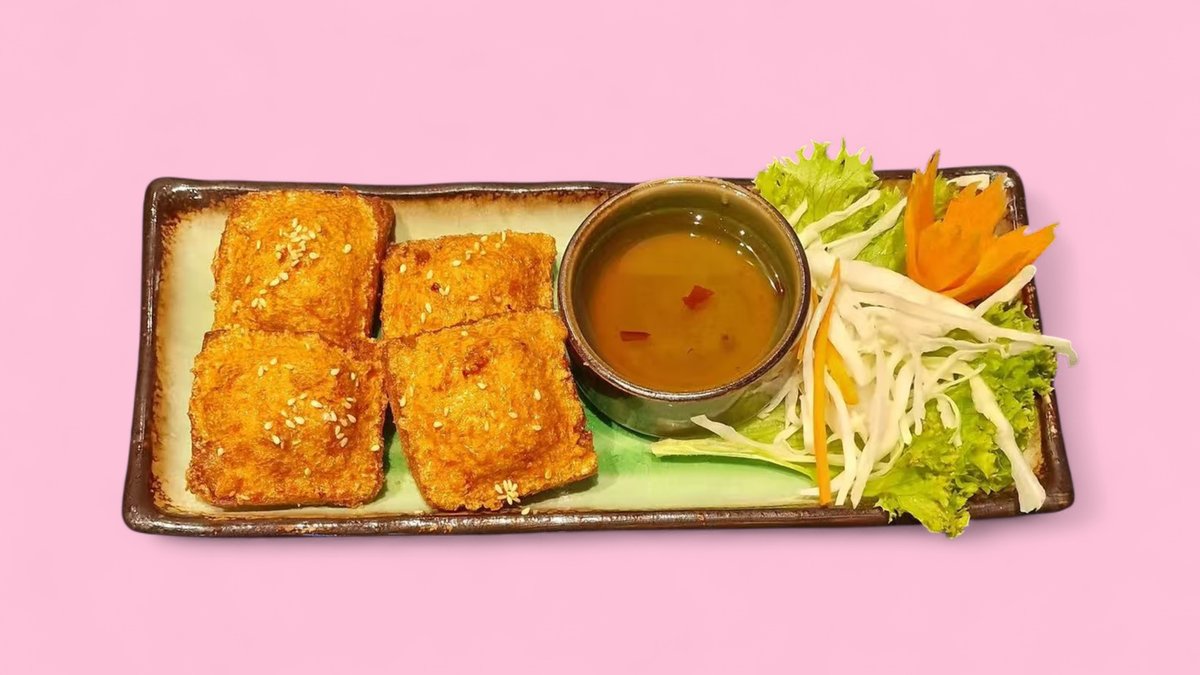 chopped, seasoned shrimps and chicken on toast with sweet and sour sauce