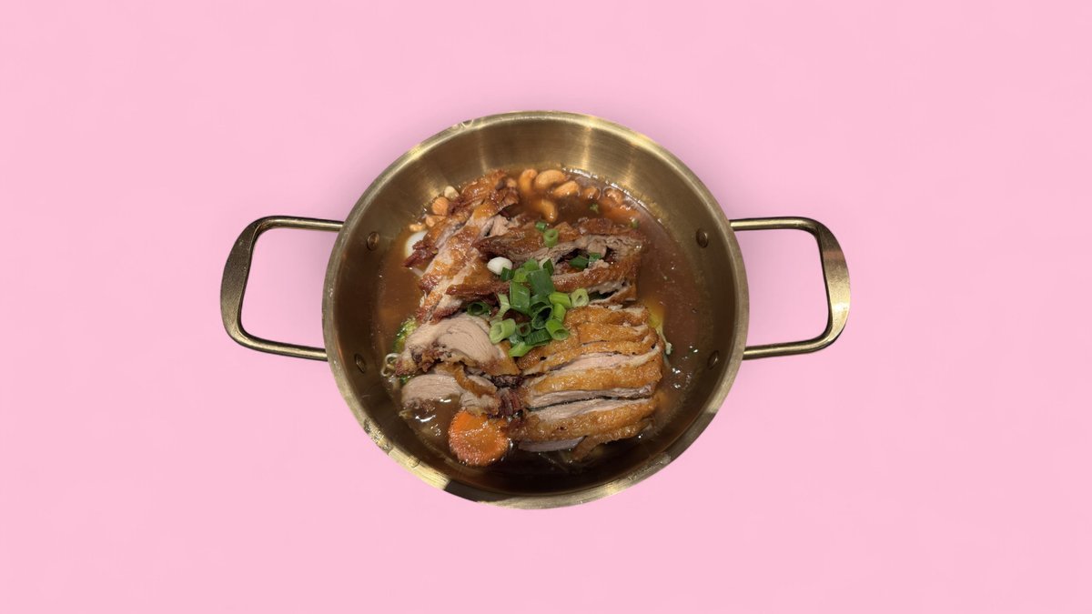 crispy duck with water chestnuts and cashews on egg noodles, served with peanut sauce and soy sauce