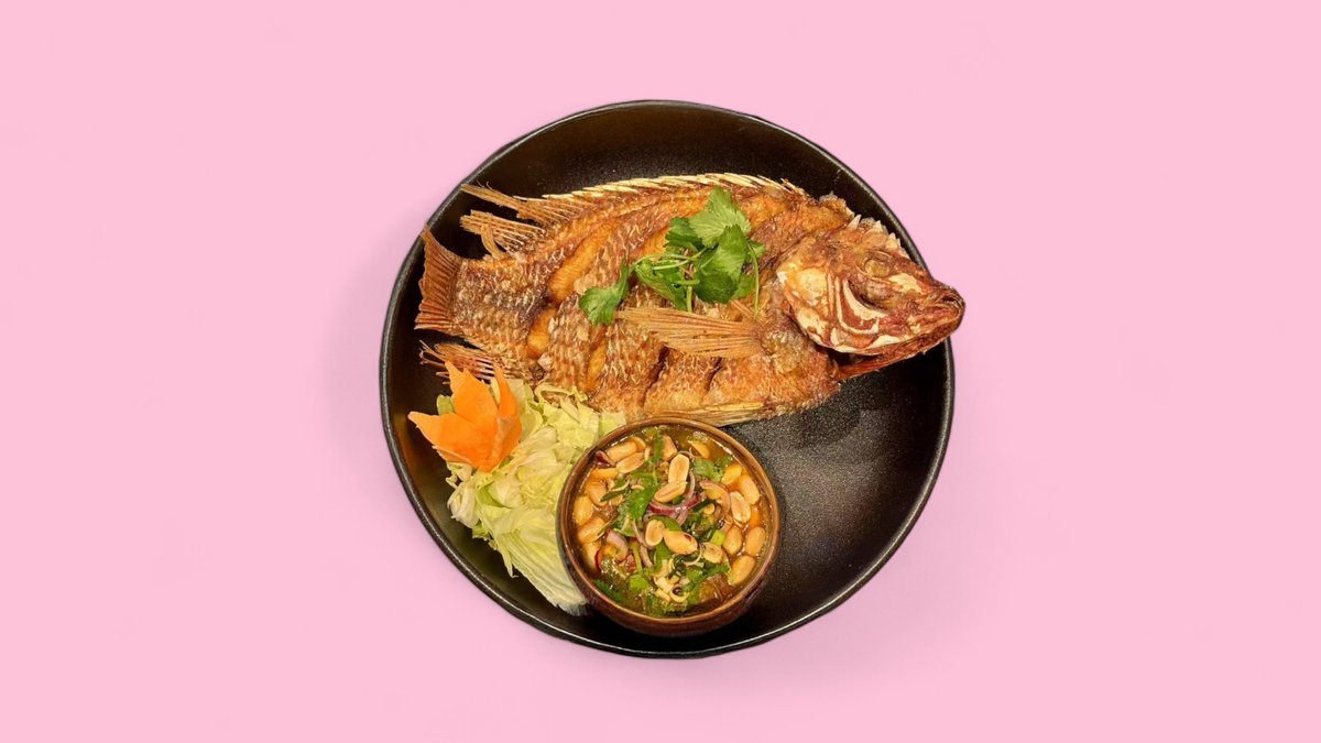 spicy whole tilapia (freshwater fish) with Thai spices, red onions, kaffir leaves and peanuts