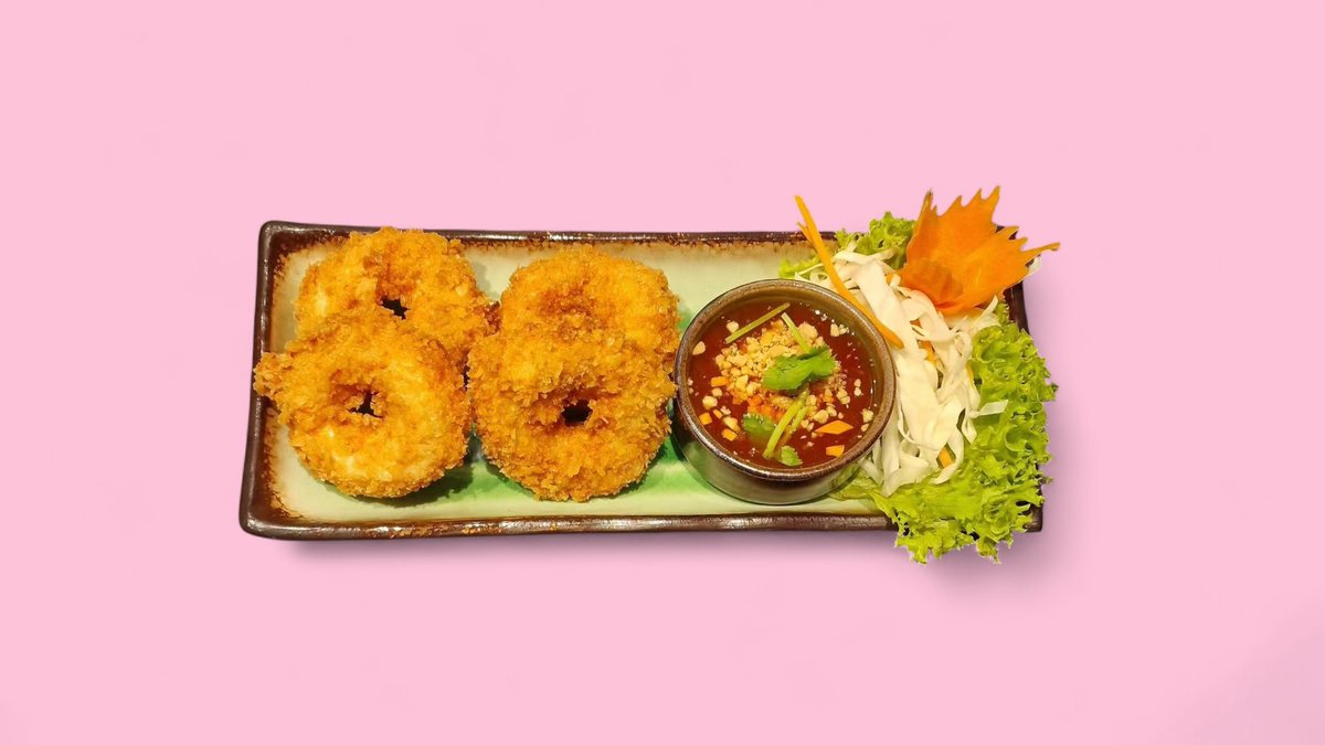 breaded prawns, deep-fried in Thai tempura style on breaded vegetables, served with sweet and sour sauce