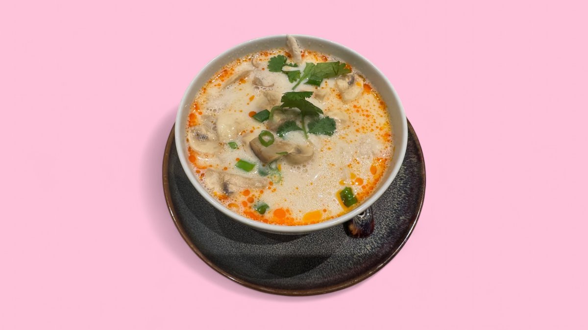 slightly spicy chicken soup with galangal, champignons, shallots, coriander and coconut milk
