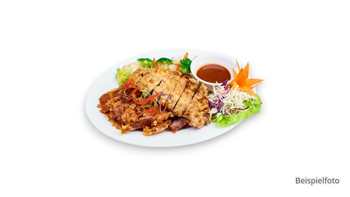 crispy duck with water chestnuts, cashews, broccoli, Chinese cabbage and bean sprouts, served with peanut sauce and soy sauce