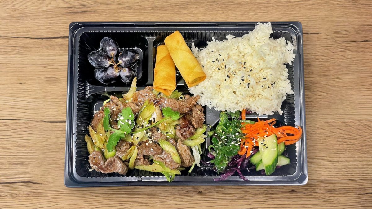 Black Angus beef strips sautéed in aioli and served on a bed of sliced celery. CONTENTS: Spring rolls, salad, rice, protein, fruit, wakame seaweed